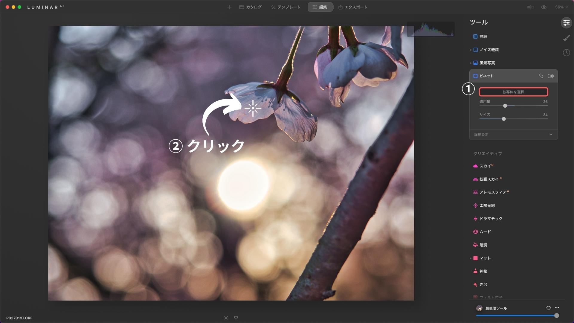 まず、「被写体の選択」をクリックし、写真の被写体をクリックします。