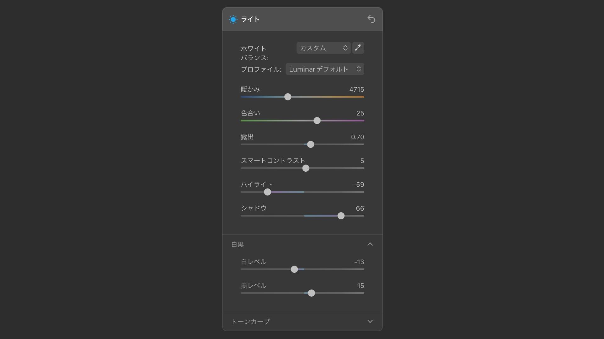 ライトのツールでは、主に写真が明るすぎたり、暗すぎたりしないように調整します。