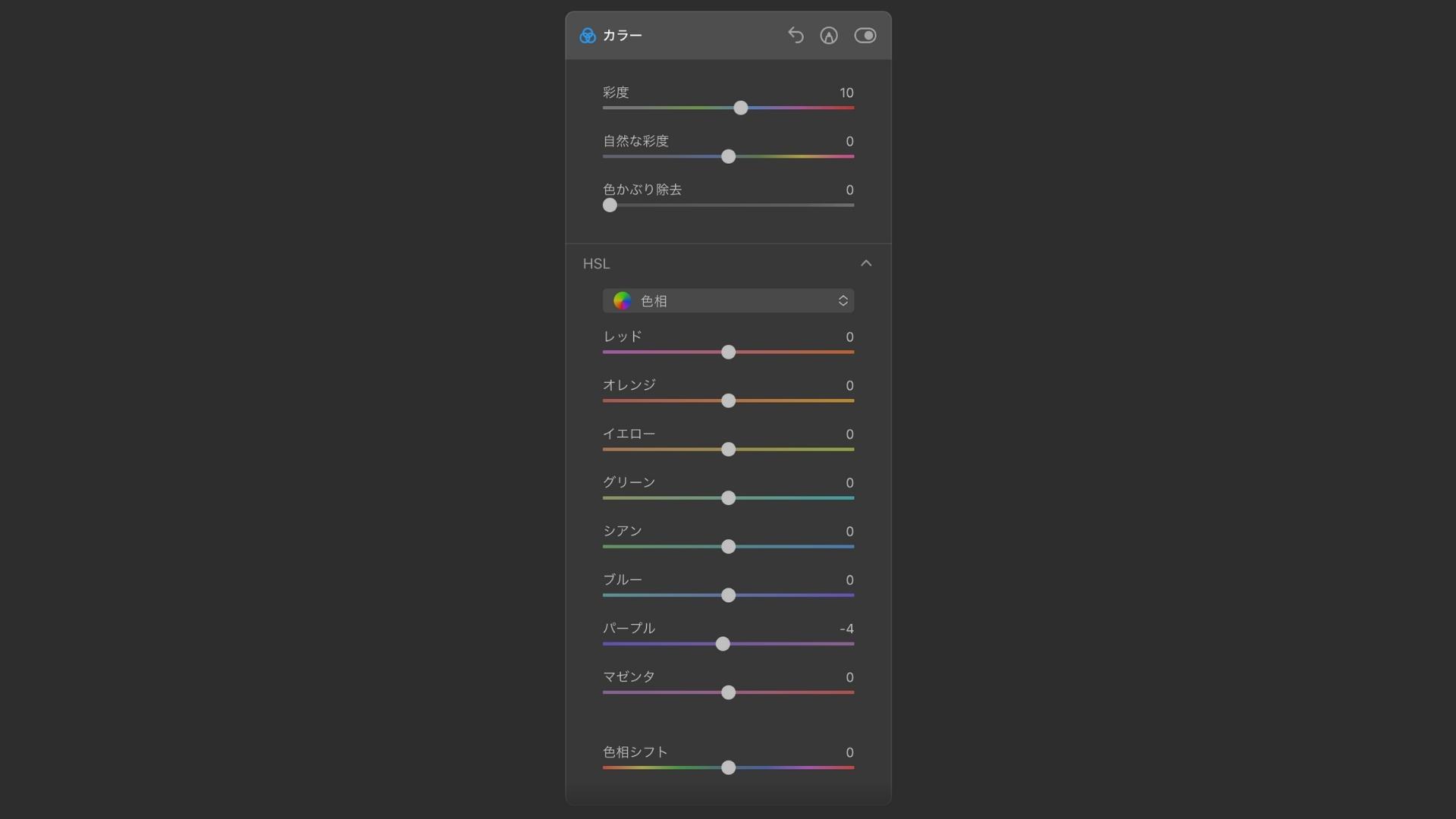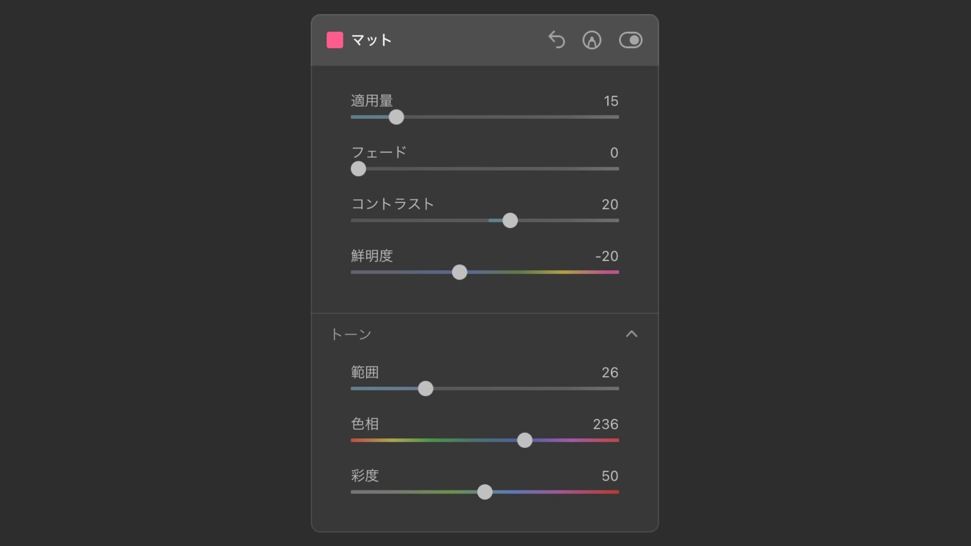 1. 適用量を50ぐらい 2. トーン範囲も50ぐらい 3. 好みの色相に調整する 4. トーン範囲を違和感ない程度に下げる 5. 適用量をいい感じに調整する