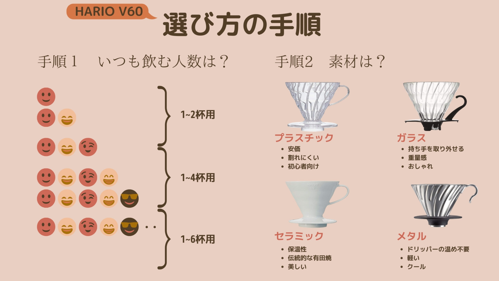 HARIOのV60ってサイズや素材がいっぱいあるけど、どれが自分に合っているか分からない