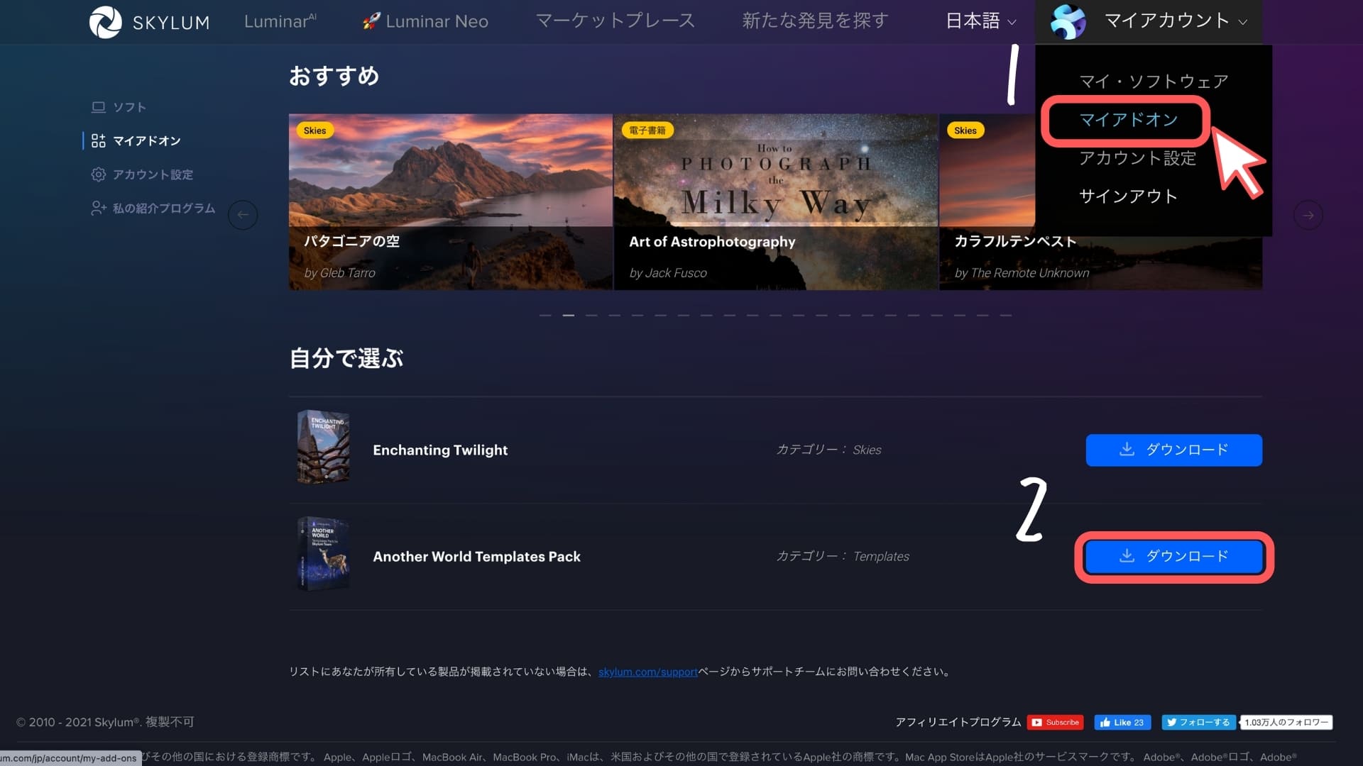 テンプレートを購入すると、ルミナーAIの公式ページの「マイアカウント→マイアドオン」というところに先程購入したテンプレートが表示されます。
