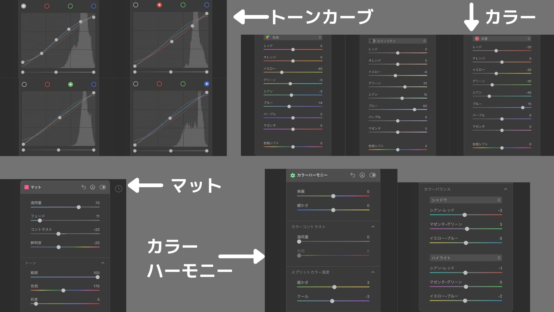 これをトーンカーブ、HSL、カラーハーモニー、マットの順番で調整していきました。