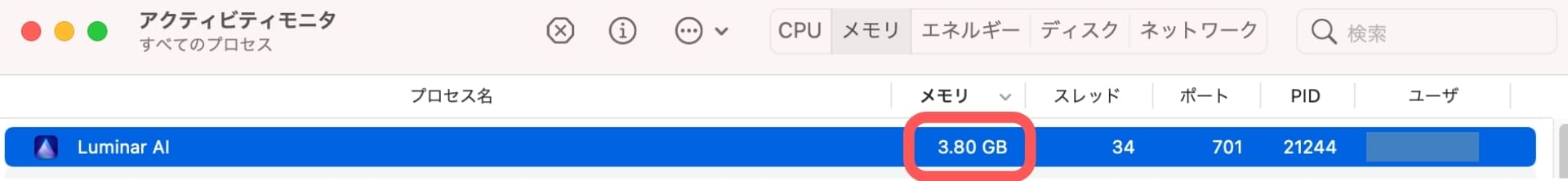 ルミナーAIでは、結構メモリを消費しています。