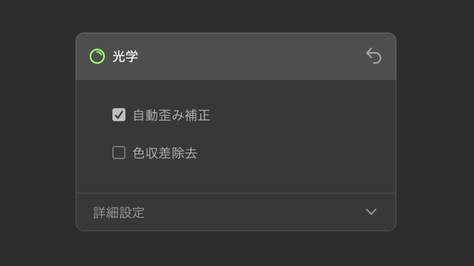 光学の自動歪み補正によって、ワンクリックで補正することができます。
