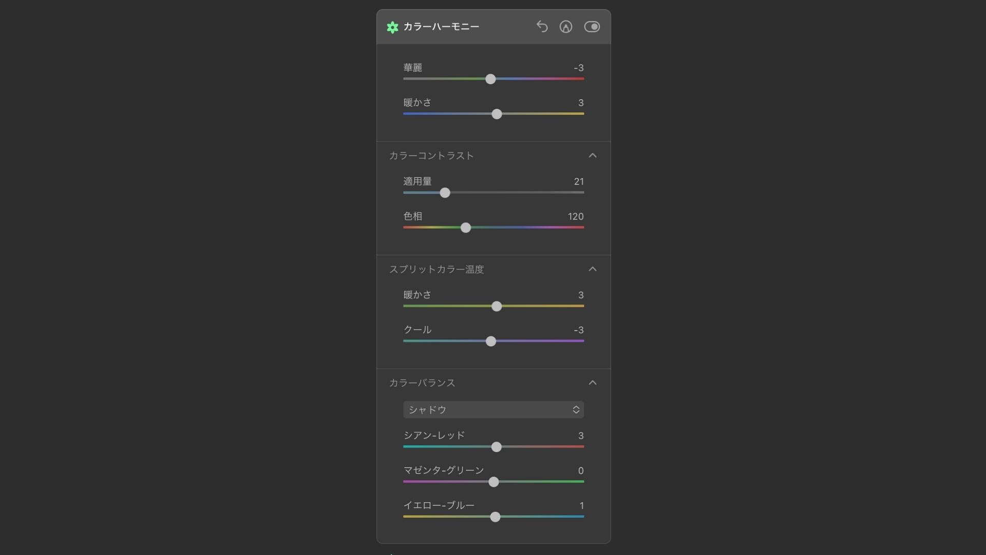 カラーハーモニーは、直感的に写真全体のカラーを調整できます。