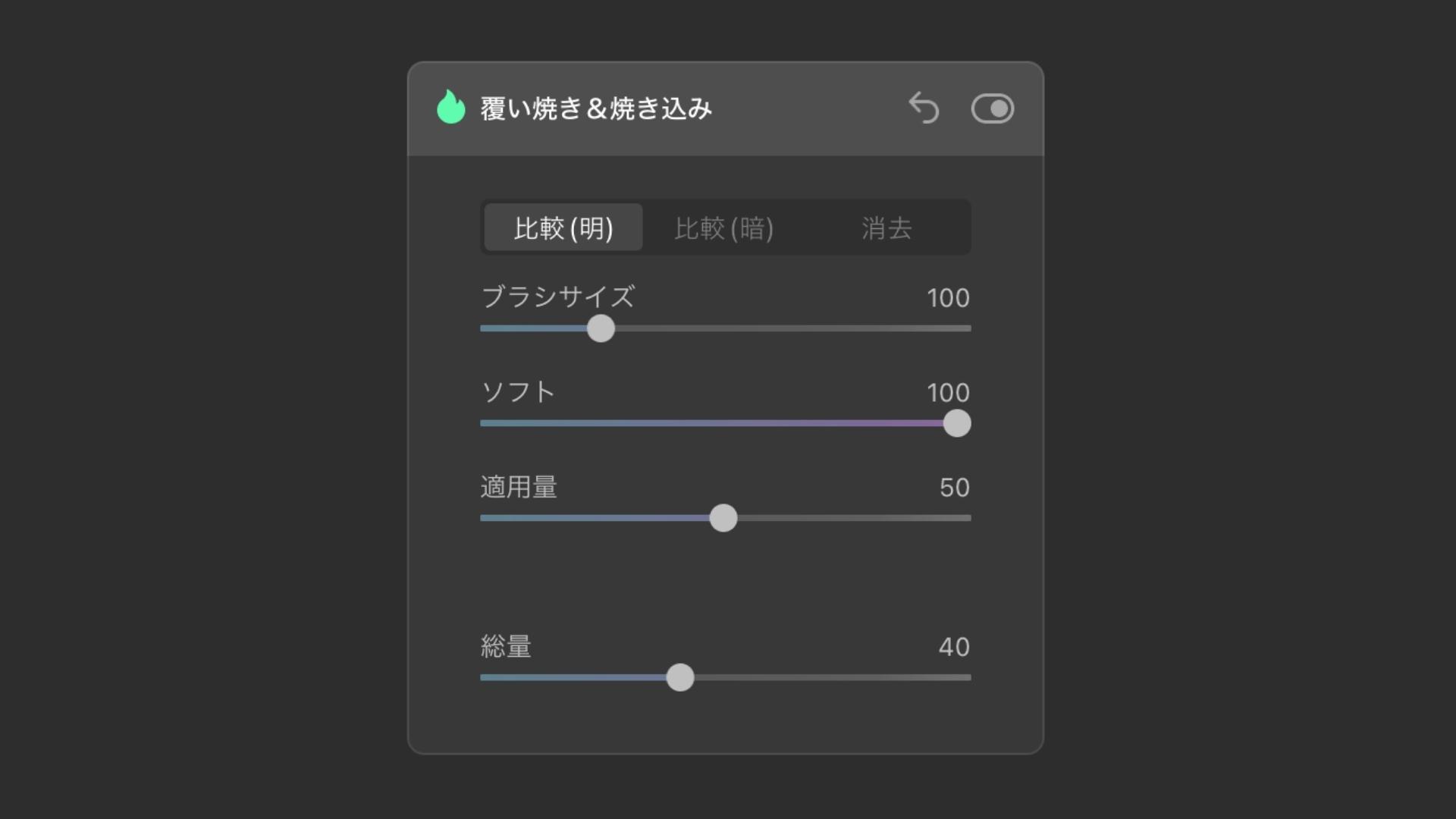 覆い焼き&焼き込みは、ブラシを使って特定の場所の明暗を補正するツールです。