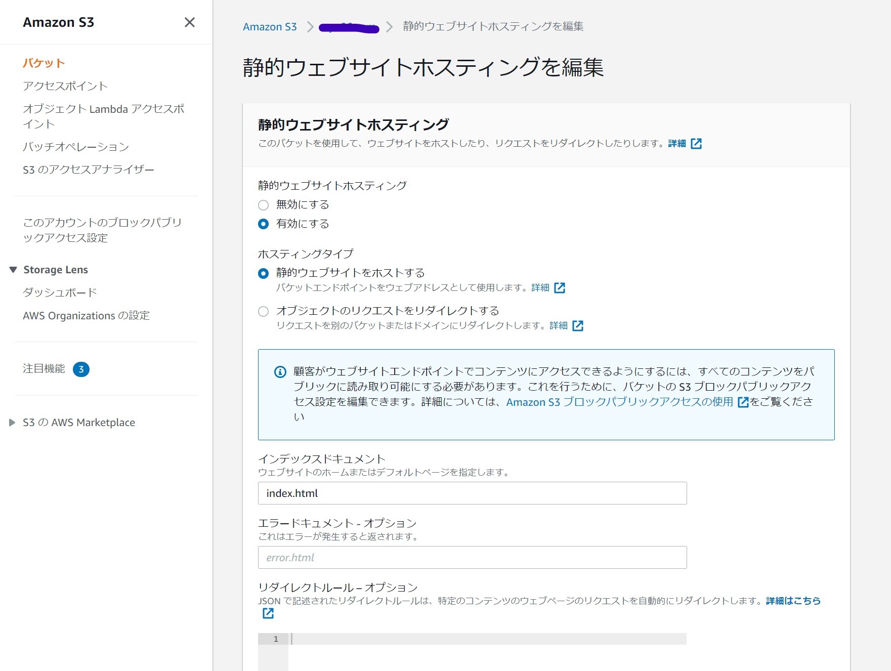一番下の静的ウェブサイトホスティングの編集をクリックし、以下のように設定